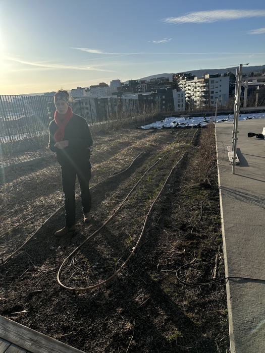 Til sist fikk de som ikke bukket under for kulda, en omvisning på resten av taket, der de hadde både treningssenter, bikuber, meitemarkhotell, frukttrær og -busker, skogsområde og ytterligere en stor grønnsakshage som leverer til resturanter i nærmiljøet. Nesten 7000 kvadratmeter - og alt sammen med en av Oslos beste 360 graders utsikt!